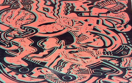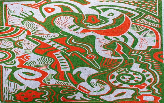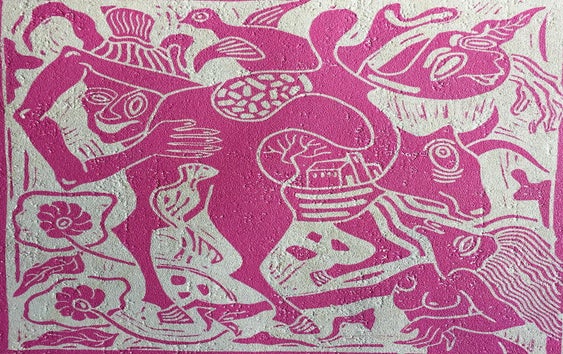acryl op papier, Chinese inkt, laag- en hoog druk.