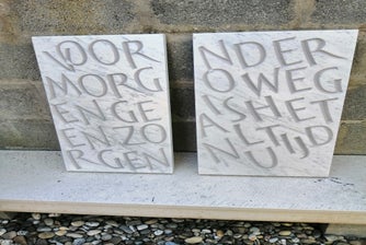 Ongeveer vijftien jaar ben ik bezig met letterkappen. Ik heb les gevolgd in Brugge en Torhout, Je vindt mij steevast op maandagavond in tic st Rembert te Torhout. Thuis, in Westkerke, heb ik een kleine werkplaats waar ik me kan uitleven. Ik werk met witsteen, blauwsteen, leisteen en verschillende marmersoorten. Mijn ontwerpen komen uit mezelf of in opdracht, gaande van sierstukken tot gebruiksvoorwerpen tot grafstenen, vooral voor huisdieren dan, ik kap alles nog handmatig uit, met beitel en hamer,,,,het duurt dus wel een tijdje voor een steen af is, soms worden letters ingekleurd met olieverf. Het kunnen Romeinse kapitalen zijn of een sierschrift, De ene letter kan dik zijn, andere haarfijn,,,,,soms is er rond de letter gekapt, andere keren is de letter ingewerkt,,,er zijn verschillende mogelijkheden,,,stel gerust je vraag mocht je er een hebben.
